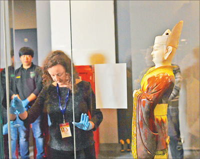 工作人员将唐代墓葬俑放入展柜。新华社记者 金良快摄