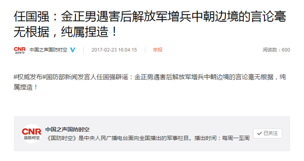 国防部新闻发言人任国强辟谣:金正男遇害后解放军增兵中朝边境的言论毫无根据,纯属捏造!