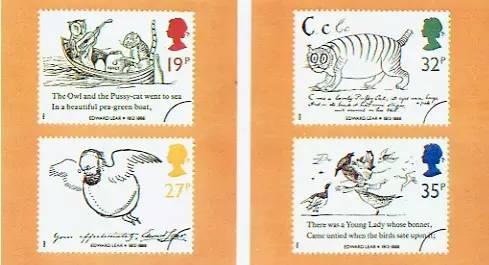1988年9月6日,英国幽默作家爱德华?利尔逝世一百周年的纪念邮票。爱德华?利尔不仅以荒唐诗著称,同时也是一位漫画家,邮票上的图案均来自他的画作。