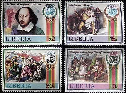 1987年,利比里亚发行了一套莎士比亚主题邮票。左上角以莎士比亚像为图案,其余邮票图案都取自莎士比亚的戏剧。