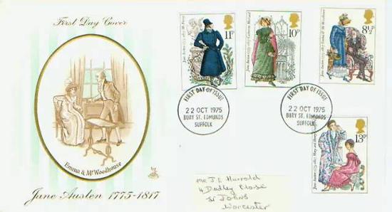 1975年,英国发行邮票,纪念女作家简·奥斯汀诞辰200周年。邮票图案从左至右为:《傲慢与偏见》中的达西先生、《诺桑觉寺》中的女主角凯瑟琳?莫兰、《爱玛》中的爱玛与伍徳豪斯先生,右下为《曼斯菲尔德庄园》中的克劳福德兄妹。