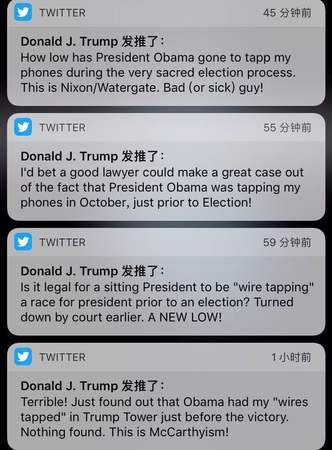 特朗普称这简直就是“麦卡锡主义”,是水门事件的翻版。 特朗普在推文上发问,这是合法的吗?并指责奥巴马“坏家伙”“令人恶心的家伙”!