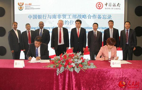 人民网约翰内斯堡3月27日电 (记者 李志伟)当地时间27日下午,中国银行与南非贸易工业部“战略合作备忘录”签约仪式在中国银行约翰内斯堡分行举行。南非贸工部部长罗布·戴维斯、中国银行董事长田国立出席签约仪式并致辞。南非经济发展特区首席执行官、中国驻南非使馆经商参赞荣延松、中国银行约翰内斯堡分行行长程军等出席活动。