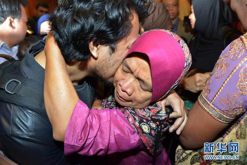 3月31日,在马来西亚吉隆坡,先前遭朝鲜禁止离境的马来西亚公民抵达机场后与亲友拥抱。