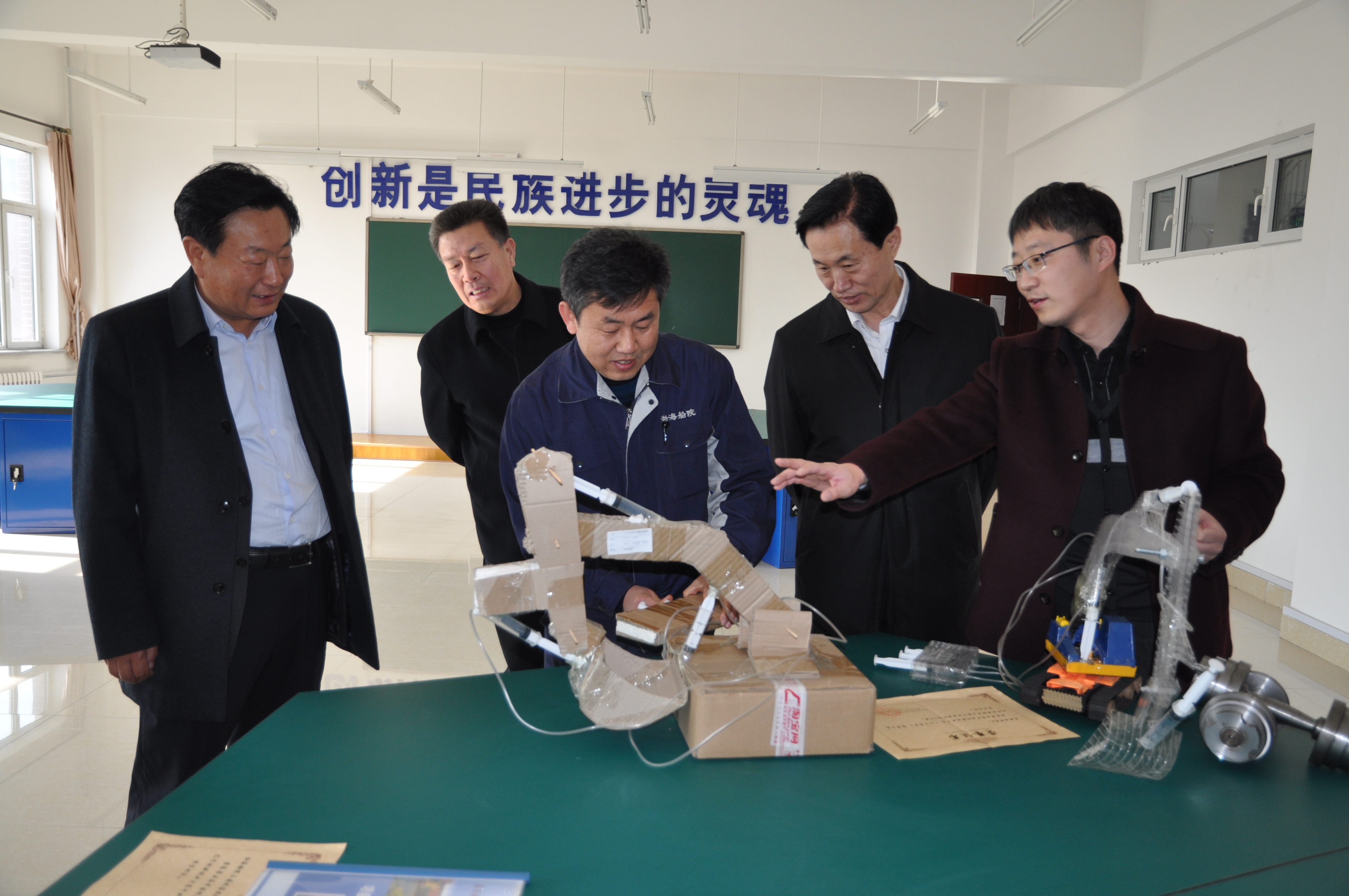 人民政协网辽宁4月14日电 辽宁省葫芦岛市政协近日围绕“双创”平台建设情况组织委员到市内大中院校调研。图为委员们在渤海船舶职业学院创新工作室,指导教师在向调研组演示学生参加创新创业大赛获奖作品。张福全摄