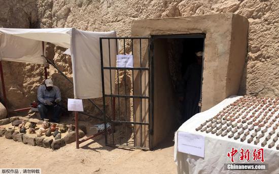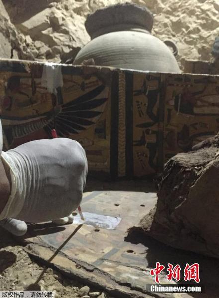 当地时间2017年4月18日,埃及卢克索,考古学家最近在挖掘一个3500多年前的墓葬时,发现了木乃伊与彩绘木棺,同时还有上千个陪葬雕像。