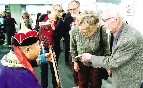 图为在德国柏林的中国文化中心,工作人员在文化年活动上向参观者介绍马头琴。新华社记者 单宇琦摄