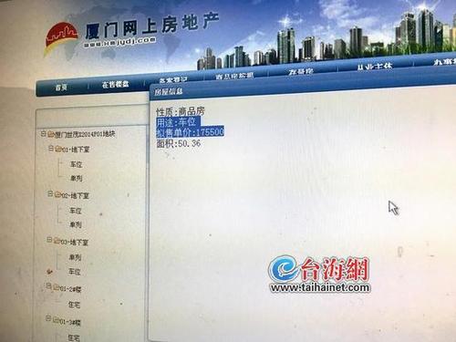 在厦门网上房地产页面上,导报记者输入“厦门世茂X2014P01”查询,看到预售许可证取得日期为2015年3月27日,点击楼盘表还可以看到,01-地下室的车位拟售单价为175500元。