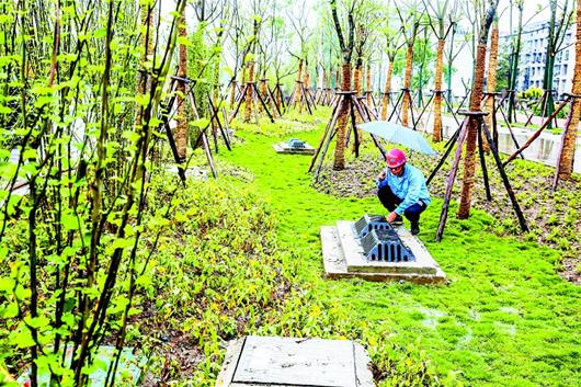 项目负责人介绍,行车道由北向南设置了缓坡,雨水不在路面积留。路南的花坛采用下沉式设计,下雨时,路面汇集的雨水,可由花坛边沿的槽口流入沉淀池,淤泥和杂质在这里沉淀过滤。雨量加大,沉淀池中的水会溢出,被花坛内的夹竹桃、栾树等喜水植物吸收。遇到大雨或暴雨,花坛无法容纳时,积水可从位于花坛中央的溢流井汇入市政管网,由泵站抽排入江。