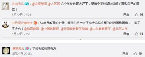 这样的学校教育受到了一致好评,“这小学教育搞得不错”、“这就是教育,孩子可以学到什么是国,什么是德,什么是人 ”,甚至有网友提到,”很多学生流行歌曲张口就会唱,国歌却不会,应该全国推广,让这种方式传遍华夏”。