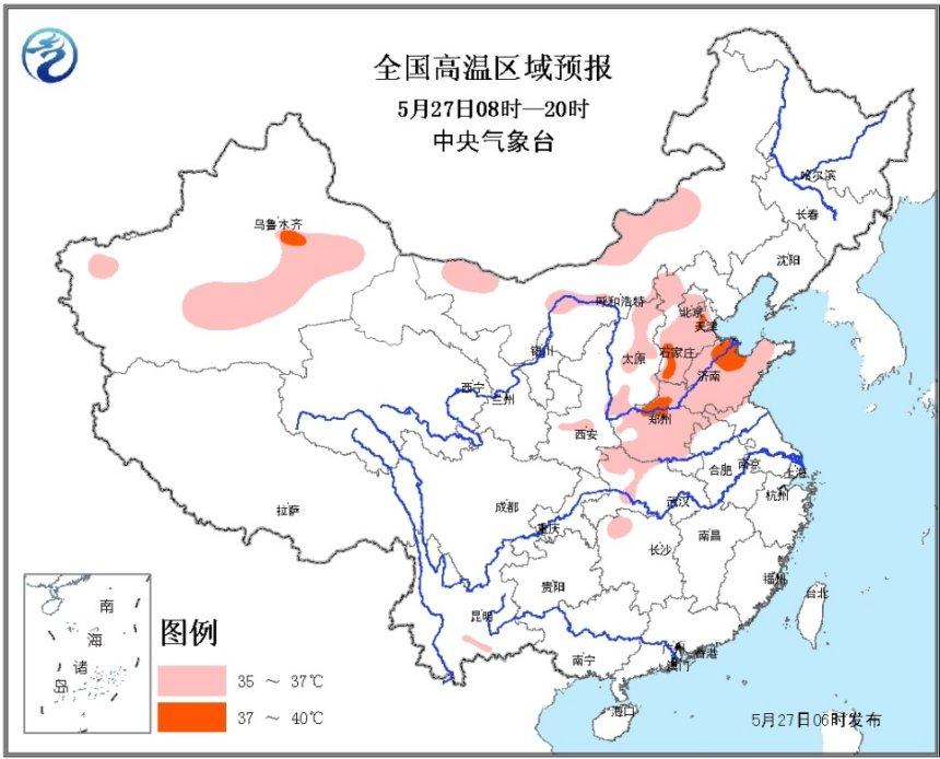 预计,5月27日白天,内蒙古中西部、北京、天津、河北中南部、山西中部、山东大部、河南大部、湖北西北部及新疆南疆盆地等地有35℃以上的高温天气,其中,河北南部、河南北部、山东北部等地的部分地区最高气温有37~39℃。
