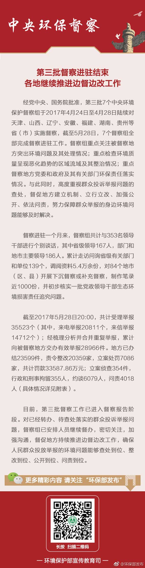 人民网北京5月30日电 据环境保护部宣传教育司官方微博消息,截至5月28日,第三批7个中央环保督察组全部完成督察进驻工作。督察进驻一个月来,督察组共计与353名领导干部进行个别谈话,其中省级领导167人,部门和地市主要领导186人。