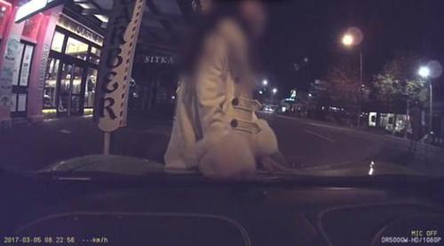 这时候一位神秘的白衣女子来到了车前,东张西望了一会儿后,直接爬上了引擎盖,还摆出了一个侧坐的pose,疑似在让旁边的朋友给她拍照。