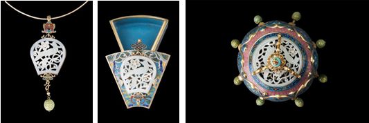 器物整体分为三重结构。上部为莲花造型熏香炉,源自中国皇室熏香文化。外饰的龟形坠饰可以单独佩戴。中部为八个扇形珐琅器皿组成的收纳套盒,可以收纳首饰珠宝,八件“喜上眉梢”组佩可以作为高级珠宝吊坠,与龟形坠饰组合佩戴。底部为小叶紫檀底座,装饰掐丝珐琅。