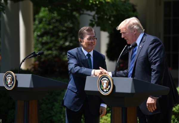 6月30日,在美国华盛顿白宫,美国总统特朗普(右)与韩国总统文在寅在联合新闻发布会上握手。