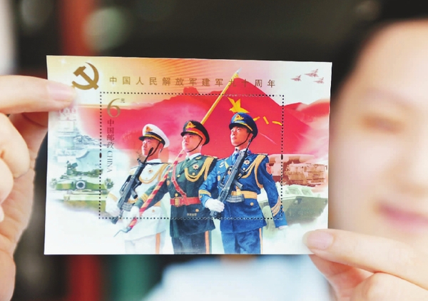 图为邮政工作人员展示《中国人民解放军建军九十周年》纪念邮票小型张。