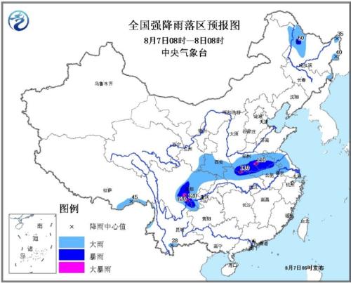 中新网8月7日电 据中央气象台网站消息,中央气象台7日06时发布暴雨蓝色预警:预计8月7日08时至8日08时,四川盆地大部、陕西南部、甘肃东南部、河南中南部、湖北北部、安徽中北部、江苏中西部以及黑龙江东部和北部等地的部分地区有大雨或暴雨,其中四川盆地南部、河南南部、湖北北部、安徽北部等地的局部地区有大暴雨(100~120毫米);上述部分地区有短时强降水,局地伴有雷暴大风等强对流天气,最大小时雨强可达60毫米。