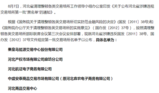 8月7日,河北省清理整顿各类交易场所工作领导小组办公室印发《关于公布河北省涉嫌违规交易场所第一批“黑名单”的通知》。
