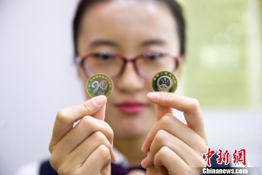 山西太原,银行工作人员正在展示纪念币。 张云 摄