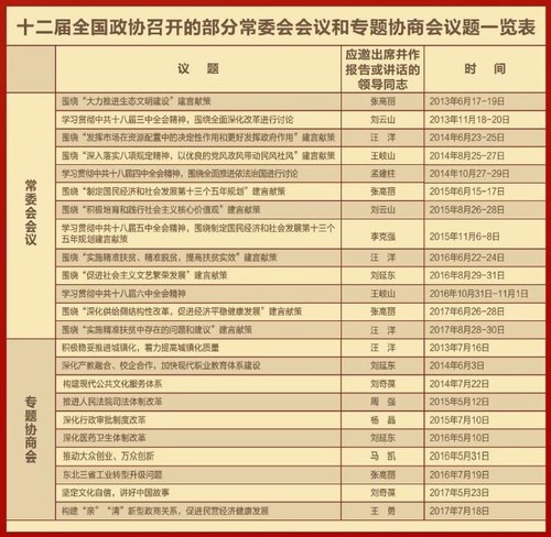 从部分常委会议和专题协商会议题一览表的议题可以看到,全国政协聚焦推动科学发展、全面深化改革中的重大问题和群众最为关切的问题,广泛协商、广纳群言、广集民智,增进共识、增强合力。这些议题回应了习总书记在庆祝政协成立65周年大会上的重要讲话中提出的要求。而表中应邀出席并作报告或讲话的领导同志名单,则充分体现了党中央、国务院对政协有关会议的重视,这样的会议自然开得有内容、有效果。