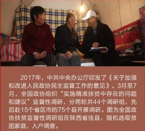 全国政协开展的一些经常性工作,如提案工作、专题调研工作,也有展示。实物展品《情系国计民生:政协提案的故事》、《把握人民的意愿:政协第十二届全国委员会提案及办理复文选》与“政治制度优势不断彰显”“人民民主不断扩大”的单元题目相呼应。有关扶贫监督性调研的图片是调研组成员走进窑洞、坐上炕头,深入贫困户家里入户调查的场景。这项调研的层次、规模、力度和覆盖面,都创本届全国政协之先,取得重要履职成果。如此规模的调研活动,在人民政协的历史上也不多见。就是在这次调研的基础上,全国政协召开了围绕“实施精准扶贫中存在的问题和建议”建言献策的专题议政性常委会议哦!