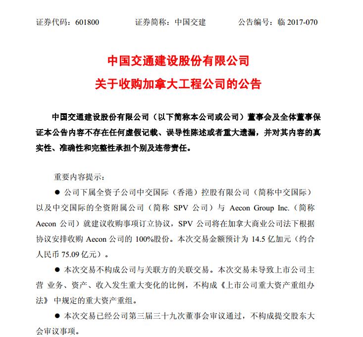 中国交建75亿人民币并购加拿大百年工程巨头公司Aecon