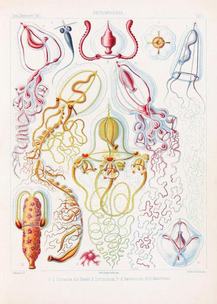 在 19 世纪的德国,海克尔是位家喻户晓的人物。他是名杰出的生物学家,曾将达尔文的进化论引入德国,并在其基础上不断完善人类的进化论理论,还引入了“生态学”、“门”等在如今生物学中被普遍应用的术语。而绘制插画,是他辅助个人科学研究的一个手段。