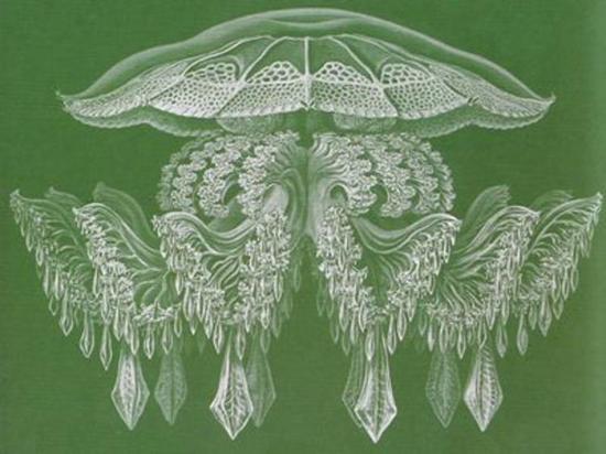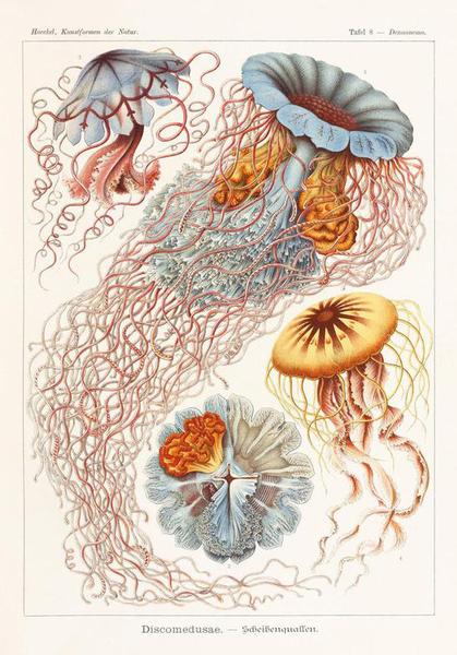 看那幅最著名的安娜赛丝霞水母插图(Desmonema annasethe)就知道了。这种水母长着花状顶盖和一堆细长触须。海克尔定格了它在水中游动的某一瞬间,将顶盖画成了一朵蓝色的葵花,并用流畅的线条让繁茂的触须肆意地飘动起来。海克尔以自己的妻子 Anna Sethe 的名字为这种水母命名,因为水母的触手,让他想起了妻子海藻般浓密的头发。