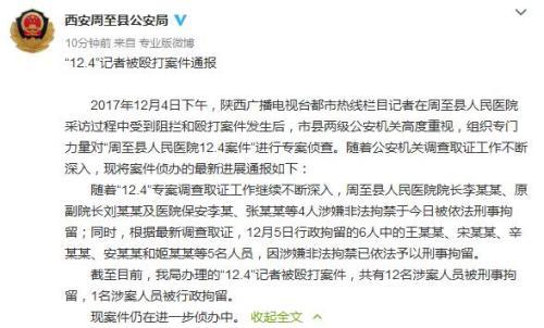 新华社西安12月7日电(记者姚友明 陈晨 冯国栋)12月4日,陕西广播电视台一名记者在西安市周至县人民医院采访时遭院方多名工作人员殴打。目前,当地公安部门侦办案件调查过程中,已对1名涉案人员行政拘留,12名涉案人员刑事拘留。然而,网络上对媒体所报道的周至县人民医院“天价停尸费”一事仍有争议。
