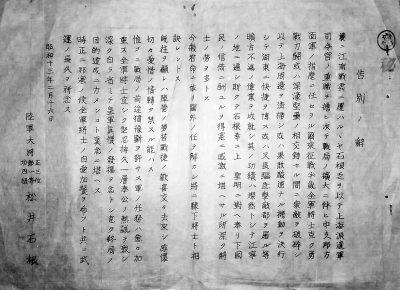 1938年2月16日,南京大屠杀元凶日军大将松井石根回国告别辞(秘件)。