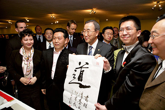 2007年,吴欢赠时任联合国秘书长潘基文的书法作品