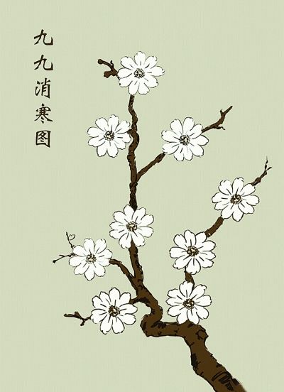 “日冬至,画素梅一支,为瓣八十有一,日染一瓣,瓣尽而九九出,则春深矣。曰‘九九消寒图’。”