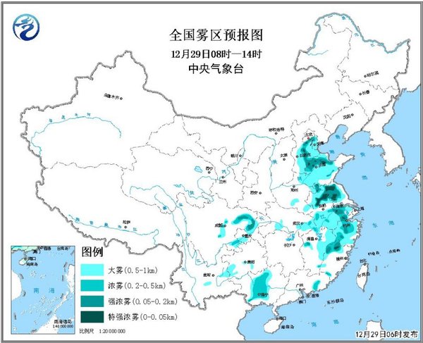 预计,29日早晨至上午,北京东南部、天津、河北中南部、山东中西部、江苏、安徽、浙江、湖北东部、江西东部、广西中部、四川盆地东部等地有大雾,其中,北京东南部、天津北部、河北中南部、山东西北部、江苏北部和西南部、安徽北部、浙江西部、广西中部、四川盆地东部等地的部分地区有能见度低于500米的浓雾,局地有能见度低于50米的特强浓雾。中央气象台12月29日06时发布大雾橙色预警。