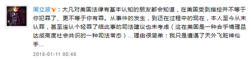 北京时间11日凌晨,周立波在微博发文表示,“在美国受到指控并不等于你犯罪了、更不等于你有罪。从事件的发生,到还在过程中的现在,本人至今从未认罪,甚至连认个轻罪了结此事的司法建议也未考虑。”