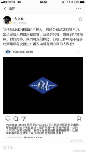 多名网友爆料称,余文乐潮牌madness官网把港澳台归到国家,并提供了中英文截图,图中还可以看到madness官网把“台湾”纳入进了海外地区;网站更新文字内容后,文字由“世界各地大部分国家”改为了“世界各地大部份地区”。余文乐昨夜微博致歉。