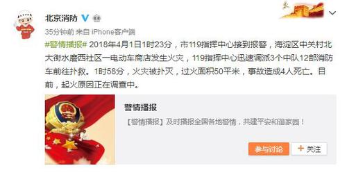 人民网北京4月1日电 据北京市公安局消防局官方微博消息,北京市海淀区4月1日凌晨发生一起火灾事故,造成4人死亡。