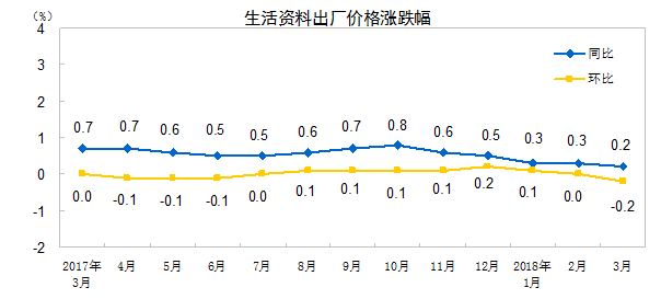 2018年3月份,全国工业生产者出厂价格同比上涨3.1%,环比下降0.2%。工业生产者购进价格同比上涨3.7%,环比下降0.3%。一季度,工业生产者出厂价格同比上涨3.7%,工业生产者购进价格同比上涨4.4%。