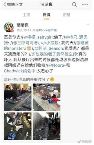 事情起源于某活动结束后,观众被批在现场留下大量垃圾,@洁洁良在微博转发网友留言,并评论“恶臭你支”。有网友好心私信提醒,“支那”是侮辱中国的意思,但@洁洁良表示,“废话,不侮辱,我说它干嘛”,并发表更多侮辱言论,且拒绝删帖。辱华言论激怒网友。