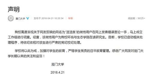 厦门大学官方微博发表回应称,网名为@洁洁良的微博用户,是厦门大学环境与生态学院在读研究生,将对该生在网上发表错误言论一事,进行严肃的党纪校纪处理。