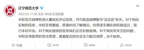 目前,@洁洁良的微博账号已被注销,@洁洁良的本科母校辽宁师范大学在官方微博发表回应,表示会全力配合调查,绝不姑息。(央视记者 周培培)