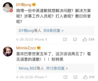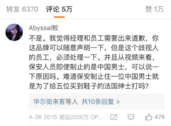 “微博一份中英道歉就想解决问题?解决方案呢?涉事工作人员呢?打人者呢?”网友“DY桐ong”说。网友“ABYSSAL鲛”也表示,经理和员工需要出来道歉,品牌可以“随意声明一下”,但是歧视人的员工必须处理。
