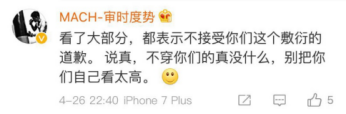 网友“王13日”表示:“您说话的语气好像是说,很正常,下次发生下次再道歉就完了。”网友“MACH-审时度势”也称:“看了大部分,都表示不接受你们这个敷衍的道歉。”