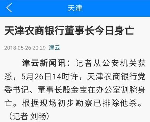据津云新闻消息,记者从公安机关获悉,5月26日14时许,天津农商银行党委书记、董事长殷金宝在办公室割腕身亡。根据现场初步勘察已排除他杀。