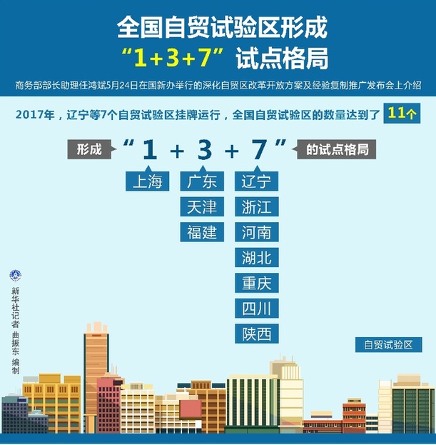 新华社北京5月24日电(记者郁琼源)商务部部长助理任鸿斌5月24日在国新办举行的深化自贸区改革开放方案及经验复制推广发布会上介绍,2017年,辽宁等7个自贸试验区挂牌运行,全国自贸试验区的数量达到了11个,形成“1+3+7”的试点格局。