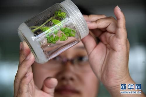 在山东省科学院生态研究所实验室,技术人员王贻莲在查看西红柿组织培养实验进展情况(5月11日摄)。该科研项目旨在推动中国和乌兹别克斯坦盐渍土壤的生态修复与高效利用。新华社记者郭绪雷摄