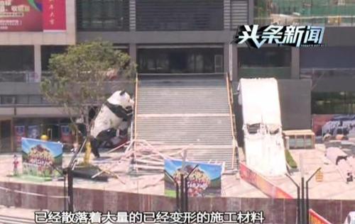 据了解当时正是有几人经过这个位置时,被上吊中的施工材料砸中继而被砸伤,而现场一旁的疑似扶梯上得塑料布,也被砸出了一个大洞
