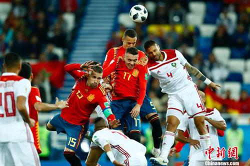 摩洛哥与西班牙球员争顶。 中新社记者 富田 摄