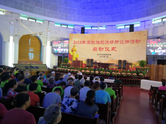 7月29日,北京市2018年宗教法规进场所巡讲活动启动仪式在市基督教丰台堂举行。市宗教局相关处室、丰台区民宗办等负责同志,市五大宗教团体秘书长及部分班子成员,丰台区天主教、基督教、伊斯兰教信教群众约600余人参加启动仪式。