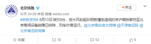 据北京铁路局发布消息称:8月12日23时04分,造成此次多趟列车晚点的原因为杭州东开往北京南的G40次运行到京沪高铁廊坊至北京南间,受到大风刮起的彩钢板撞击发生故障。8月13日3时59分,受大风刮起彩钢板撞击造成的京沪高铁廊坊至北京南间设备故障已排除,列车恢复运行。