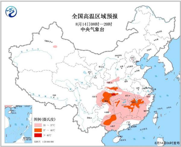 预计8月14日白天,江南大部、江汉、华南西部和北部、贵州东部和南部、四川盆地中东部、重庆大部、陕西关中地区和东南部等地的最高气温有35~36℃,其中,江西北部、四川盆地东北部、重庆中北部、广西西北部、陕西东南部等地的部分地区最高气温有37~39℃,重庆东北部局地可达40℃以上。